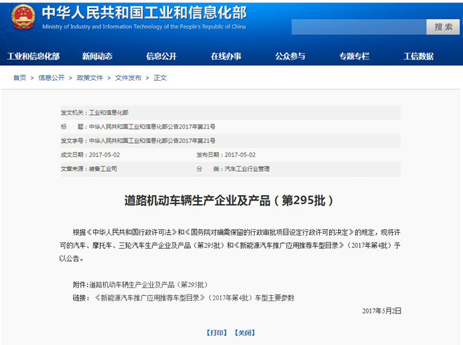 根據(jù)《中華人民共和國(guó)行政許可法》和《國(guó)務(wù)院對(duì)確需保留的行政審批項(xiàng)目設(shè)定行政許可的決定》的規(guī)定,現(xiàn)將許可的汽車、摩托車、三輪汽車生產(chǎn)企業(yè)及產(chǎn)品(第295批)和《新能源汽車推廣應(yīng)用推薦車型目錄》(2017年第4批)予以公告。