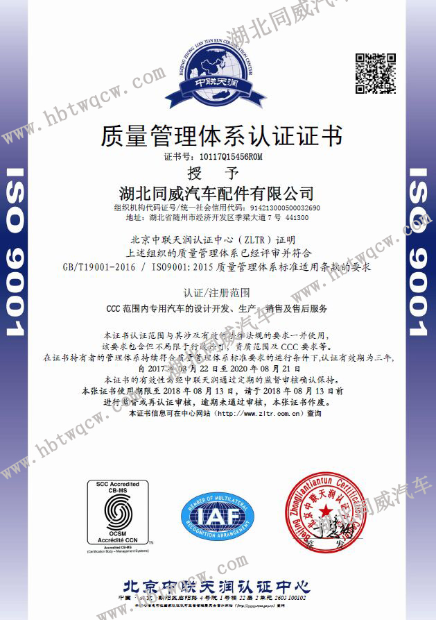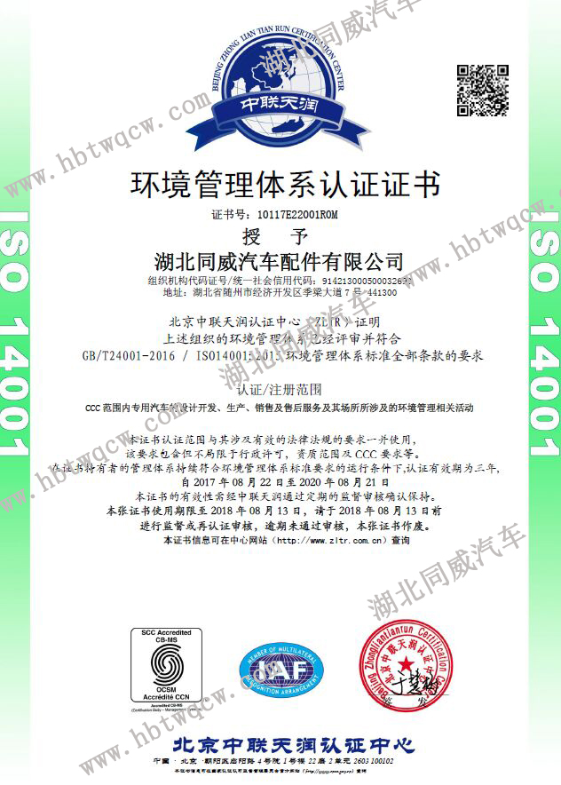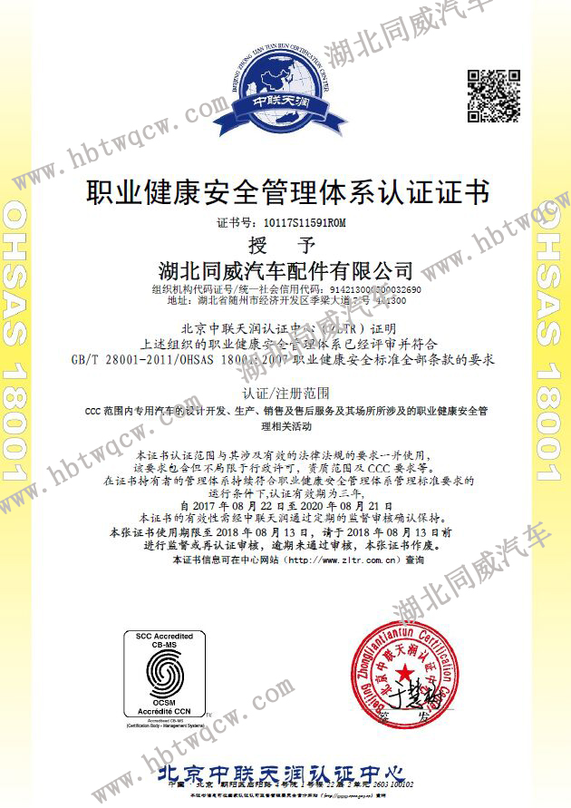 湖北同威汽車配件有限公司通過9001管理體系認(rèn)證,其中包括職業(yè)健康安全管理體系認(rèn)證證書,質(zhì)量體系管理認(rèn)證證書,環(huán)境管理體系認(rèn)證證書。