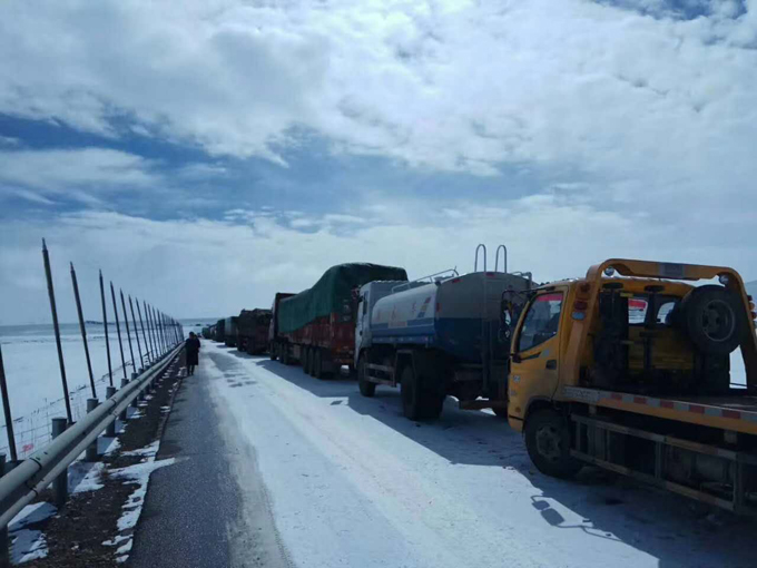 10月30日,司機(jī)抵達(dá)格爾木,繼續(xù)往前進(jìn)入唐古拉山。青藏線唐古拉段因?yàn)橄麓笱,目前造成路邊結(jié)冰。由于道路狹窄,數(shù)百輛卡車被堵在路上,情況緊急。由于唐古拉段海拔高,氣溫低,卡車司機(jī)只能使用車輛只有的暖風(fēng)系統(tǒng)進(jìn)行取暖。但是由于堵車時(shí)間長,部分車輛已經(jīng)出現(xiàn)柴油不足的情況。部分司機(jī)車內(nèi)已經(jīng)沒有食物,更有甚者出現(xiàn)無法取暖的情況,據(jù)卡友透露,已經(jīng)有部分司機(jī)出現(xiàn)高反,情況十分危急。