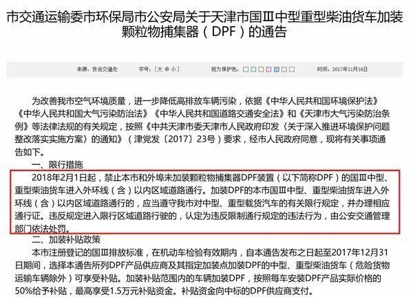 天津市要求國三柴油貨車加裝DPF才能進外環(huán),山東省要求國三貨車加裝DPF;除此之外,深圳、北京等都相繼出臺了國五車必須要加裝DPF才能上牌的規(guī)定。