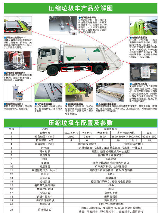| 1、該車主要專用裝置由箱體、壓縮系統(tǒng)組成,用于垃圾的收集與清運(yùn)。該車可選裝方形或弧形箱體,選裝全密封蓋裝置,選裝方形擋泥板,選裝側(cè)防護(hù)連接結(jié)構(gòu)件。選裝后部工作裝置。選裝工作裝置時(shí)外形長(mm)/前懸(mm)/軸距(mm)/后伸(mm)/整備質(zhì)量(kg)對應(yīng)關(guān)系為:①無上料裝置:8680/1400/4500/200/10845,8710/1430/4500/200/10845,8880/1400/4700/200/10845,8910/1430/4700/200/10845;②全密封斗裝置和擺臂裝置:8880/1400/4500/400/11195,8910/1430/4500/400/11195,9080/1400/4700/400/11195,9110/1430/4700/400/11195;③翻桶裝置和翻斗裝置:9080/1400/4500/600/11195,9110/1430/4500/600/11195,9280/1400/4700/600/11195,9310/1430/4700/600/11195。僅采用4500mm,4700mm軸距。2、側(cè)防護(hù)采用Q235,螺栓連接;后防護(hù)由專用裝置替代,下邊緣離地高:500mm。3、隨底盤選裝選裝高度不同的駕駛室;選裝前霧燈;選裝駕駛室頂部裝飾燈;選裝駕駛室前面罩;選裝前保險(xiǎn)杠及前部燈具,選裝后視鏡;選裝后部燈具;選裝駕駛室前臉擾流罩;駕駛室臥鋪側(cè)窗選裝裝飾板,選裝后背式排氣管。安裝帶有衛(wèi)星定位功能的行駛記錄儀。ABS型號/生產(chǎn)廠家:3631010-C2000/東科克諾爾商用車制動系統(tǒng)(十堰)有限公司,ABS 8/東科克諾爾商用車制動系統(tǒng)(十堰)有限公司, 4460046450/威伯科汽車控制系統(tǒng)(中國)有限公司。采用的發(fā)動機(jī)與油耗值對應(yīng)關(guān)系為(L/100Km):DDi50E190-60/23.9,D4.5NS6B190/24.4,D6.7NS6B230/23.7,B6.2NS6B210/23.8,B6.2NS6B230/23.8。 |