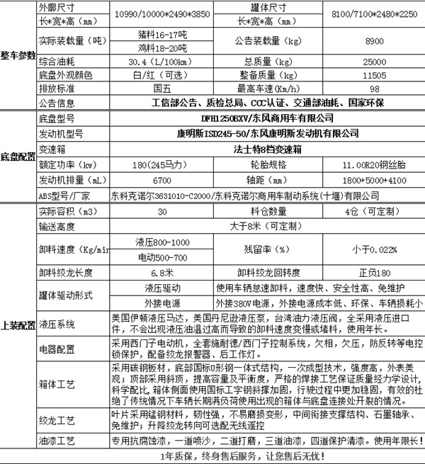 | 罐體外形尺寸:8000×2450×2250(mm),罐體有效容積:27.93立方米隨底盤選裝駕駛室;外形長(mm)/軸距(mm)/后懸(mm)/離去角(°)對應(yīng)關(guān)系為”:10990/1800+5000/2760/11,10000/1800+4100/2670/12;防護(hù)材料:Q235,連接方式:側(cè)后防護(hù)均采用焊接連接,后部防護(hù)斷面尺寸(mm):120×60,后部防護(hù)離地高度(mm):450。安裝帶衛(wèi)星定位功能的行駛記錄儀。ABS生產(chǎn)廠家:東科克諾爾商用車制動系統(tǒng)(十堰)有限公司;型號:3631010-C2000.;發(fā)動機(jī)與油耗值的對應(yīng)關(guān)系分別為:ISD210 50/33.7(L/100Km),ISD245 50/33.6(L/100Km),ISD210 50/33.7(L/100Km),ISD270 50/33.6(L/100Km),ISD285 50/33.5(L/100Km)。該車專用裝置為絞龍,飼料倉,用于運(yùn)輸散裝飼料,自卸方式:絞龍?zhí)嵘孕。選裝后部樣式。 |